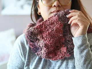 You’ll be feeling that crafting bliss when you see how quickly this cute little scarf works up in bulky weight yarn. The chunkiness of the yarn really makes the chosen stitch (side saddle cluster stitch) stand out. I especially love that the yarn is self-striping so you can make a multicolor scarf without having to change colors manually or weave in any extra ends.
