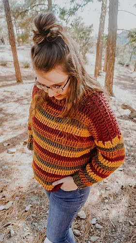 There are so many reasons to love fall crochet patterns but my top reason can be summed up in just two words: sweater weather! You just can’t beat a sweater and a pair of jeans for the sheer amount of cuteness and coziness combined. The pattern for this stunning striped sweater calls for single, double, and treble crochet stitches as well as front and back post stitches.