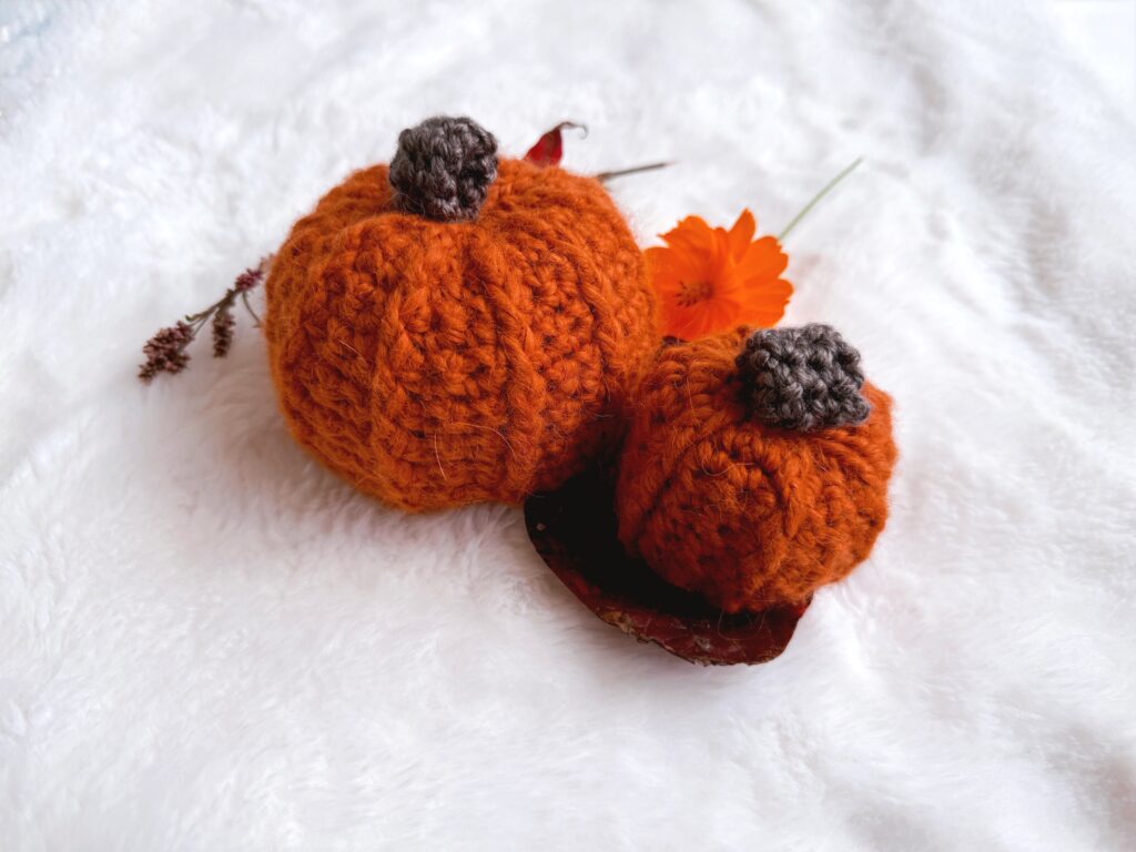 If you’d like to make a larger pumpkin, it’s easy to do. Just increase the stitch count in multiples of 3 and repeat the last 2 rows as many times as you like for the height of the pumpkin.
