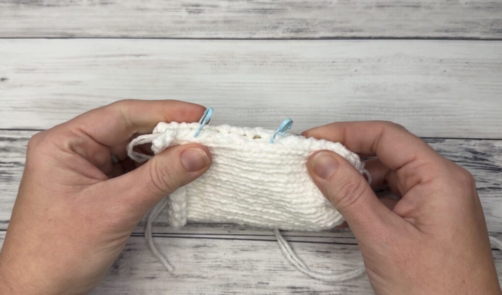 Cut yarn, leaving a long tail for seaming. Thread your yarn needle, slip each stitch purlwise onto yarn needle, then pull tightly to close bottom.