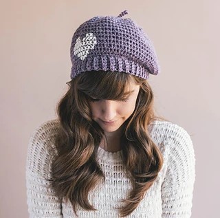 Have you been dreaming of a visit to the city of love? You can bring a piece of the streets of Paris home with the next of our cute berets. A dreamy shade of purple is perfectly accented by an adorable cross stitch heart made with white yarn. A mini version of this beret would be perfect for a little girl in your life. The pattern calls for just single and half double crochet stitches.