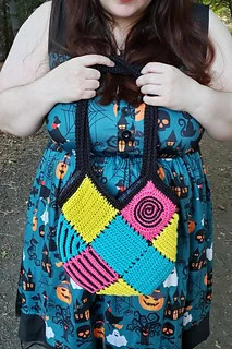 For those who appreciate the spooky aesthetic all year round and not just during October, this Nightmare Before Christmas inspired design is just the thing. The pattern uses 3 different kinds of basic granny squares and 4 different solid colors of yarn along with some simple whip stitch and embroidery for embellishment. You just need to know the basic crochet stitches for this design: single, half double, double, and treble crochet.