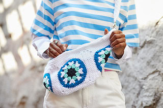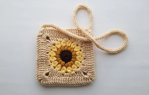 Crochet granny square bags don’t get much simpler in terms of construction than this straightforward sunflower design. All you have to do is sandwich the two granny squares together and then attach them on three sides. Add a simple, yet sturdy icord strap and you’re ready to strut. The pattern calls for double crochet, treble crochet and puff stitches. yt