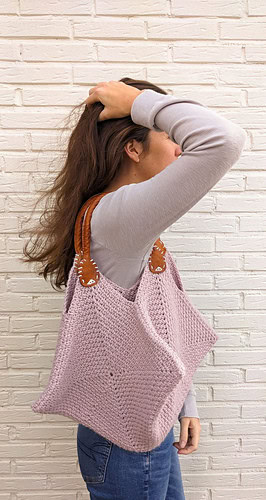 Let’s get a little geometric with our next granny square bag design. The pattern uses four large moss stitch squares sewn together to form the interesting shape. This is a very roomy bag that’s perfect for holding large projects like blankets and sweaters and even for summer vacation. A premade leather strap makes the design feel more polished and provide a sturdy strap that won’t stretch out like some other crochet ones.