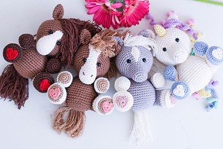 Here’s a clever idea! Did you know that you could use crochet horse patterns to make ponies and unicorns too? Here we see four stuffed animals made with the same base pattern but with adorable differences in the color palette and mane. Seeing photos like these really get the wheels turning in my head, how about you?