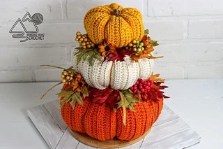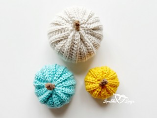 You can finish most crochet pumpkin patterns in a single sitting, especially when they are made with a super bulky yarn weight like these ones. This free pattern is available in 3 different pumpkin sizes, so you can pick your favorite or make all 3 and stack them up. Alternating half double crochet and slip stitches provide the interesting texture.