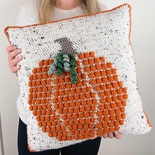 Skip the large pumpkins and opt for this gorgeous crochet throw pillow that is the embodiment of Autumn nostalgia. The herringbone half double crochet background gives the rows a cool slanted texture reminiscent of knit look fabric while the bobble stitches are the star of the pattern as they create the iconic pumpkin shape. Using a tweed yarn adds a rustic touch that really brings this design to life.
