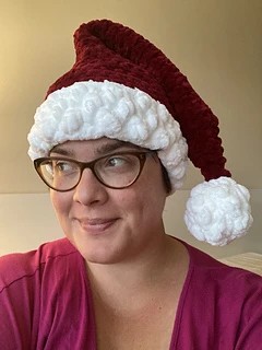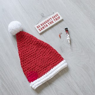 Did you know that super bulky weight isn’t the thickest yarn? This Santa hat pattern calls for jumbo weight yarn, which is the next size up with a large pattern gauge. You’ll be able to crochet this Santa hat in a snap using a smaller stitch count with such a thick yarn along with a very large mm hook. The pattern calls for just single and double crochet stitches and it is worked from the bottom up.