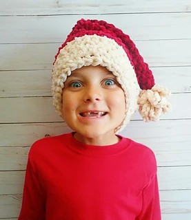 Now let’s explore some more of our unusual crochet Santa hat patterns. This design is far from traditional, but it’s just as cute. The trapper style design features earflaps with braided ties. A fitted crown is a quicker alternative to the long stocking cap styles of classic Santa hats. You’ll be using just single and half double crochet stitches for this design.
