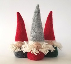 One nice thing about gnome knitting patterns for stuffed toys is that you don’t really need to worry about gauge. It is interesting to note, though, that using a thicker or thinner weight yarn can drastically affect the size of your finished project. You can see the results of 3 different weights of yarn in the photo above. The pattern calls for stockinette and garter stitches.
