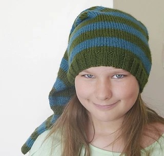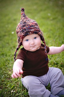 Even the youngest members of the family can hop on board the gnome bandwagon with this super cute cap. The whimsical curved point at the top and the braided earflaps make this design instantly charming. The stockinette stitch top is accented by a textured garter stitch brim.
