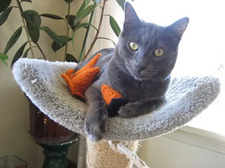 My cat is especially partial to toys that involve feathers, so I’m sure that she would be all over this cute carrot top toy. The pattern is super easy to make and because it is knit in the round you don’t need to do any purl stitches – just knit stitches. There are a couple knit options for the carrot top if you would prefer to skip the feathers.