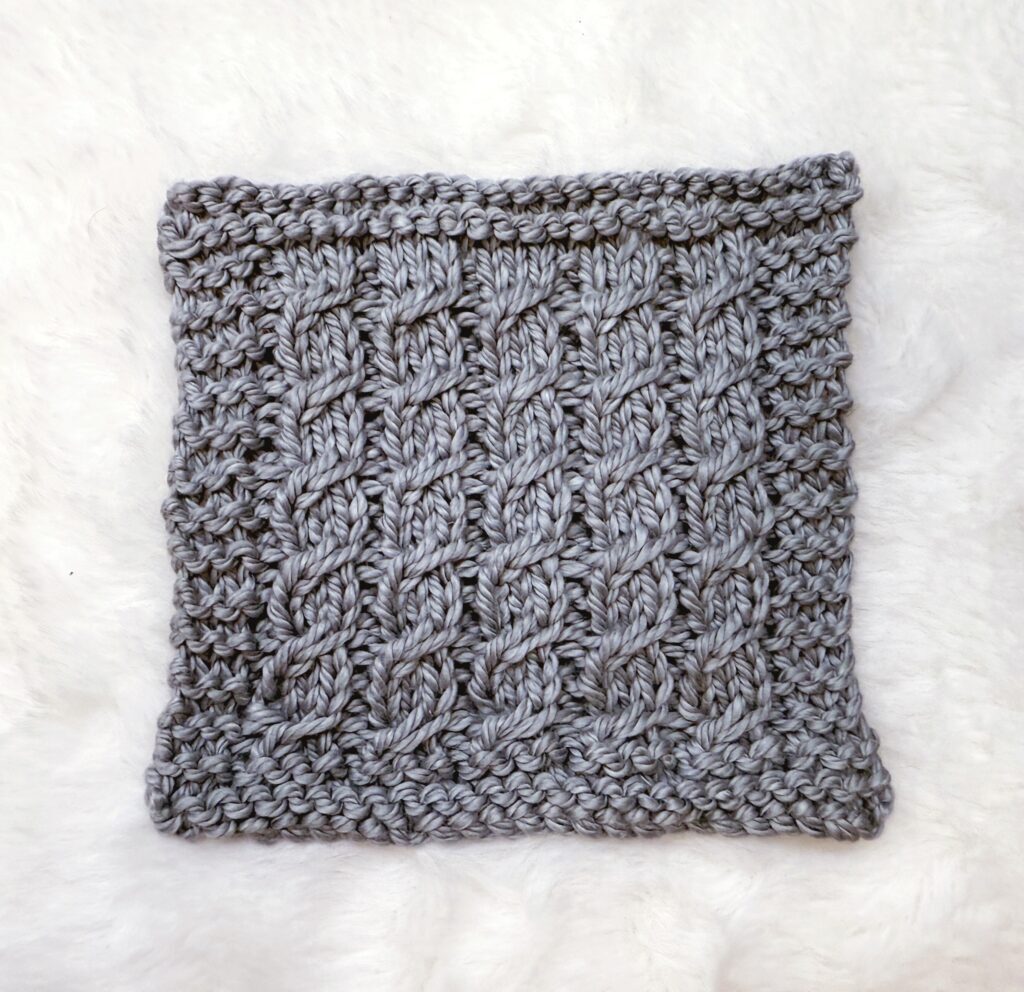 This pattern has a built-in garter stitch border, which I enjoy on my face scrubbies. It’s a great way to practice cable knitting if it’s new to you as well.